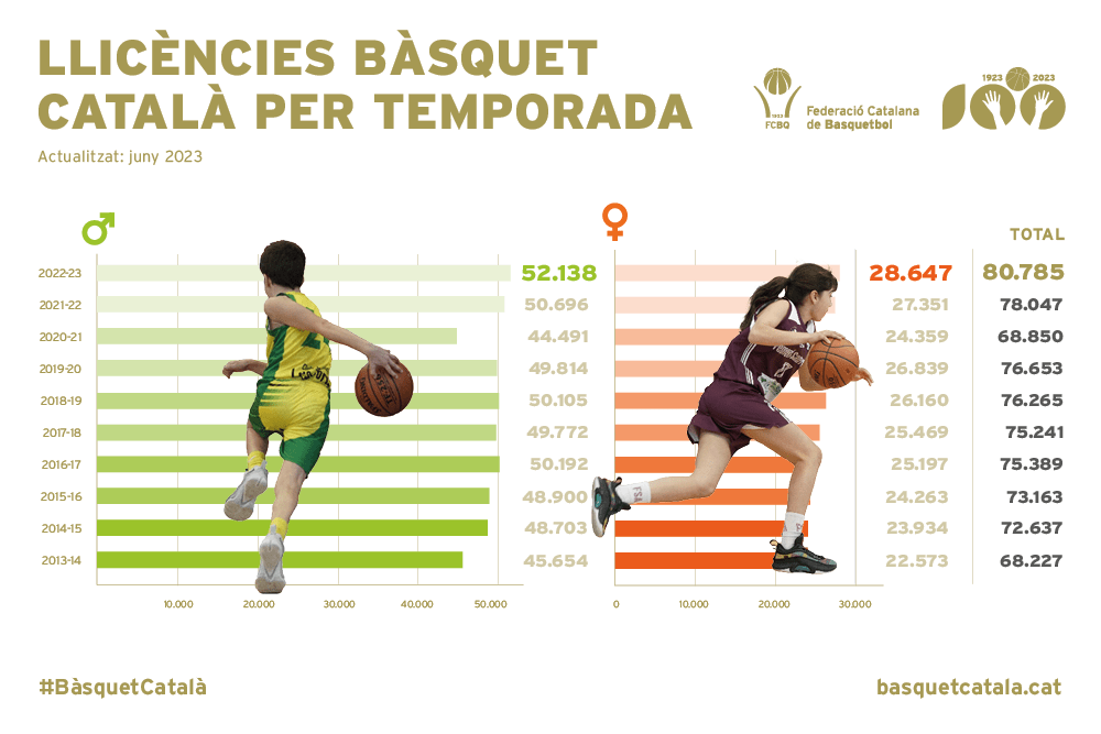 Aquesta mateixa situació també es dona òbviament en el bàsquet femení, més desconegut en general, però igual d’important en el nostre esport a nivell de llicències. Cal recordar que a juliol del 2023 de les llicències al bàsquet català el 78% són de jugadors i jugadores i, aquestes darreres, ocupen un 38% del total, un percentatge gens menyspreable però que cal seguir ampliant. I no només en l’àmbit de les jugadores sinó sobretot en l’àmbit de les entrenadores, directives i àrbitres.