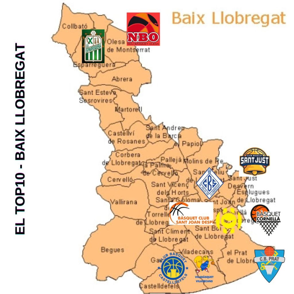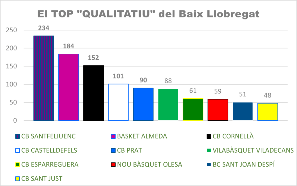Per últim, el TOP10 del Baix Llobregat, ponderant les dades anteriors i, recordo, donant-li un 80% del pes total a la part qualitativa i un 20% a la quantitativa. En aquest cas pujo fins els 10 perquè hi ha el doble de clubs que en el Barcelonès.