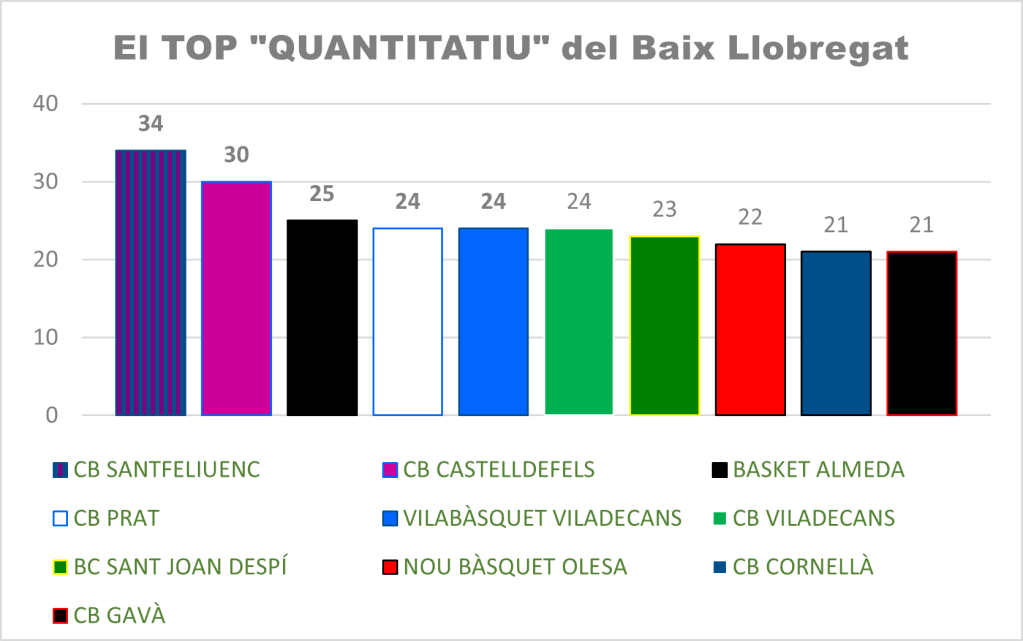 I, a continuació, la representació gràfica de la versió “quantitativa” o, el que és el mateix, el número d’equips amb els que compta cada club inscrits en qualsevol de les competicions organitzades per la Federació catalana de Basquetbol.