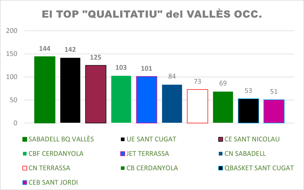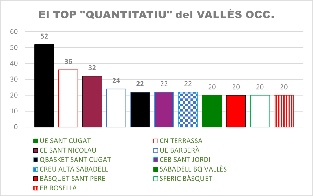 Però tot i així, aquestes ciutats i d’altres com Cerdanyola, per exemple, tenen clubs de bàsquet en el TOP de la seva comarca i del país. Clubs que desenvolupen tant el bàsquet femení com masculí i d’altres que “només” estan especialitzats en femení o masculí, com ho son els 2 clubs de Cerdanyola o 2 de Terrassa com la JET i l’SFERIC.