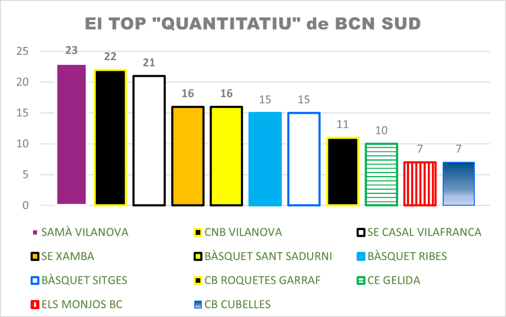 I, a continuació, la representació gràfica de la versió “quantitativa” o, el que és el mateix, el número d’equips amb els que compta cada club inscrits en qualsevol de les competicions organitzades per la Federació catalana de Basquetbol. En aquest gràfic hi surten 11 clubs, com en el cas anterior.