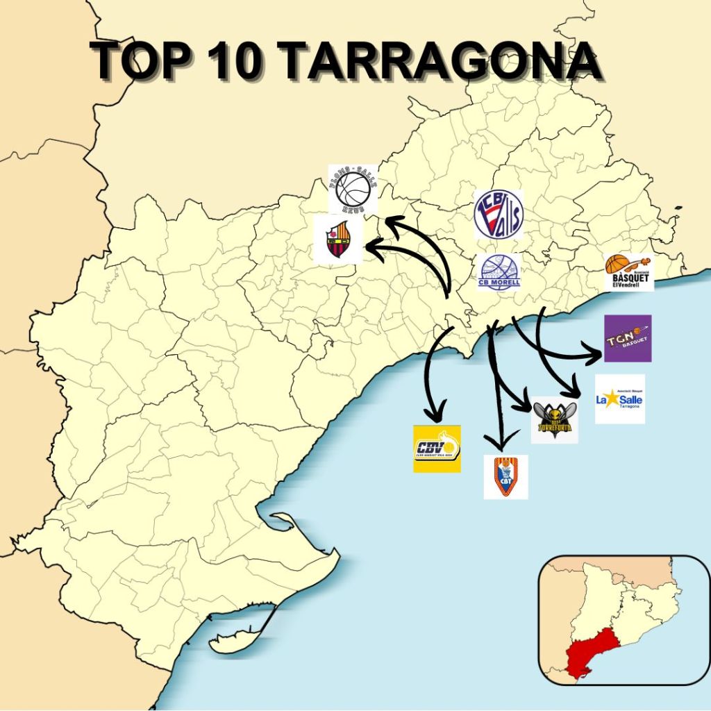 Avui us parlaré de la situació del bàsquet a la demarcació de Tarragona. Com en altres situacions plantejades en entrades anteriors, la realitat territorial és molt desigual i els clubs TOP es centralitzen en unes zones determinades. Aquest fet, sense dubtar-ho ve de diferents factors com el poblacional, les distàncies, les instal·lacions i, fins i tot, la tradició i convivència amb altres esports o activitats. En aquest cas, els clubs TOP de Tarragona es localitzen en 4 de les 10 comarques: Tarragonès, Alt Camp, Baix Camp i Baix Penedès. La importància en termes de població de Tarragona i Reus es tradueix també en la seva implantació en el món del nostre esport. Tot i això, entre ambdues localitats hi ha diferències interessants.