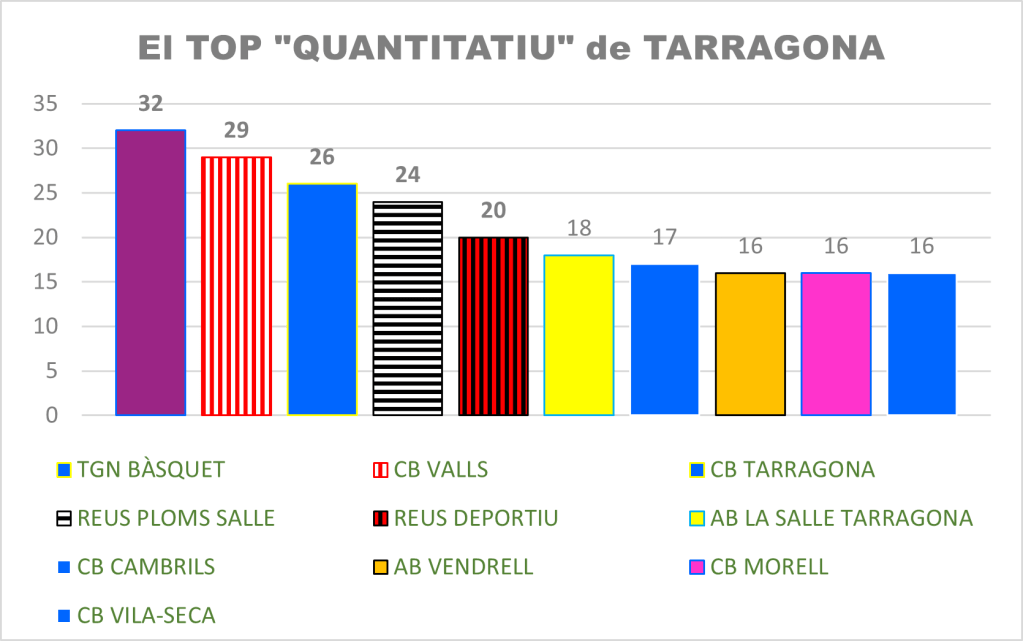 Entre els 10 primers clubs hi trobem també l’AB Vendrell del Baix Penedès, amb 1 equip a 1a i a 2a catalana i 3 equips competint als nivells de 1er any, i al CB Vila-seca, del Tarragonès que, si bé no té sènior a un nivell alt competitiu, compta amb 16 equips federats, gairebé tants com el CB Cambrils (17). Per acabar, ressaltar un club d’una zona poc poblada com la Conca de Barberà, el CB Àguiles, de Santa Colom de Queralt, amb un sènior a Copa Catalunya i el CB Cantaires de Tortosa i el CB Amposta que, tot i la distància que han de recórrer cada setmana, no defalleixen mantenint una estructura de base que compta amb 15 i 8 equips respectivament.